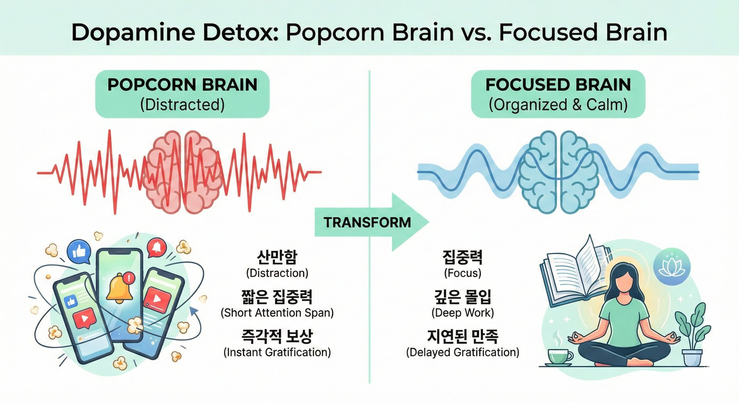 도파민 디톡스 전후 뇌 상태와 집중력 변화를 비교한 데이터 시각화 인포그래픽