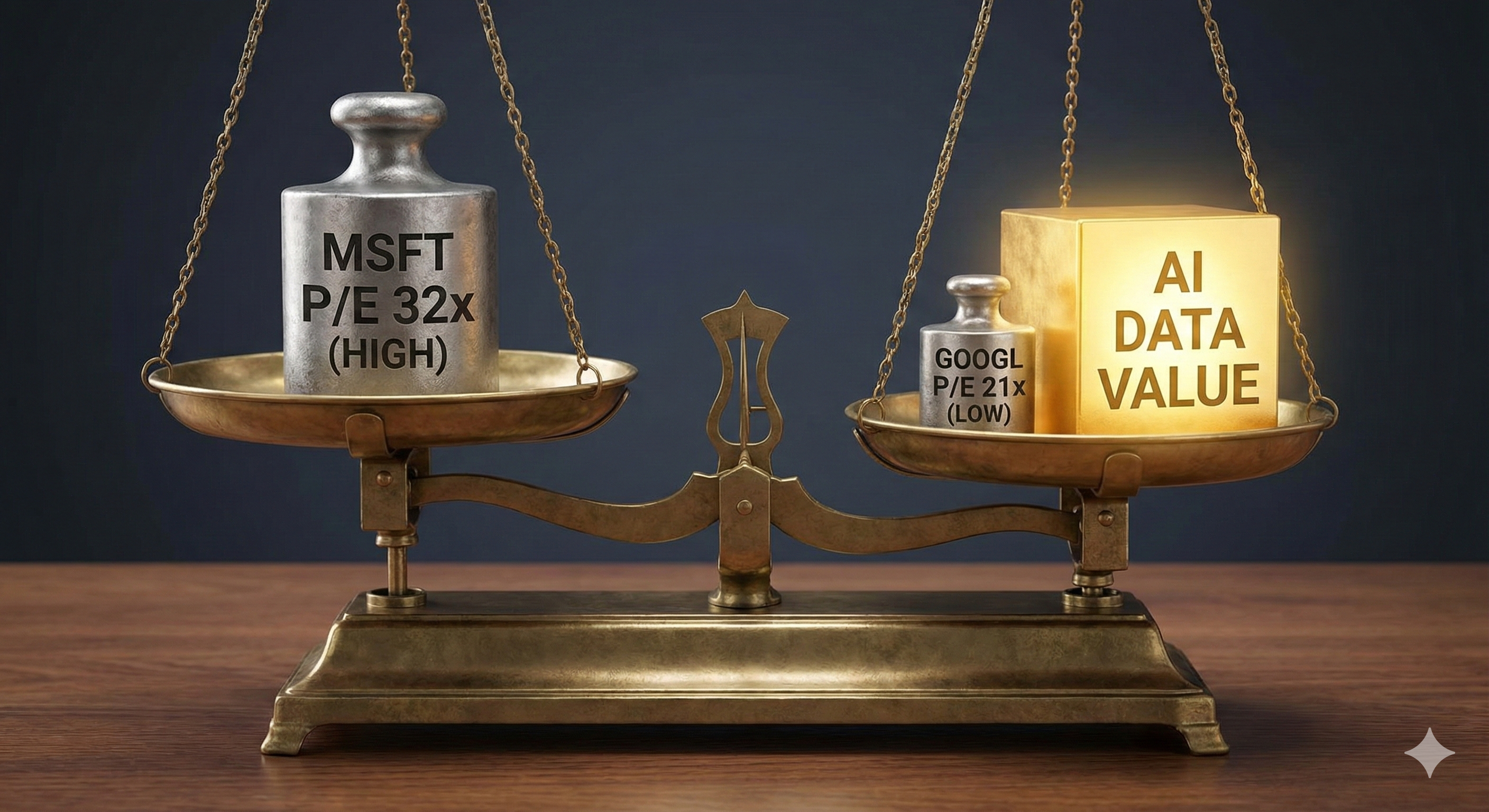 마이크로소프트 대비 알파벳(구글)의 주가수익비율(PER)이 저평가 상태임을 보여주는 저울과 황금 데이터 블록