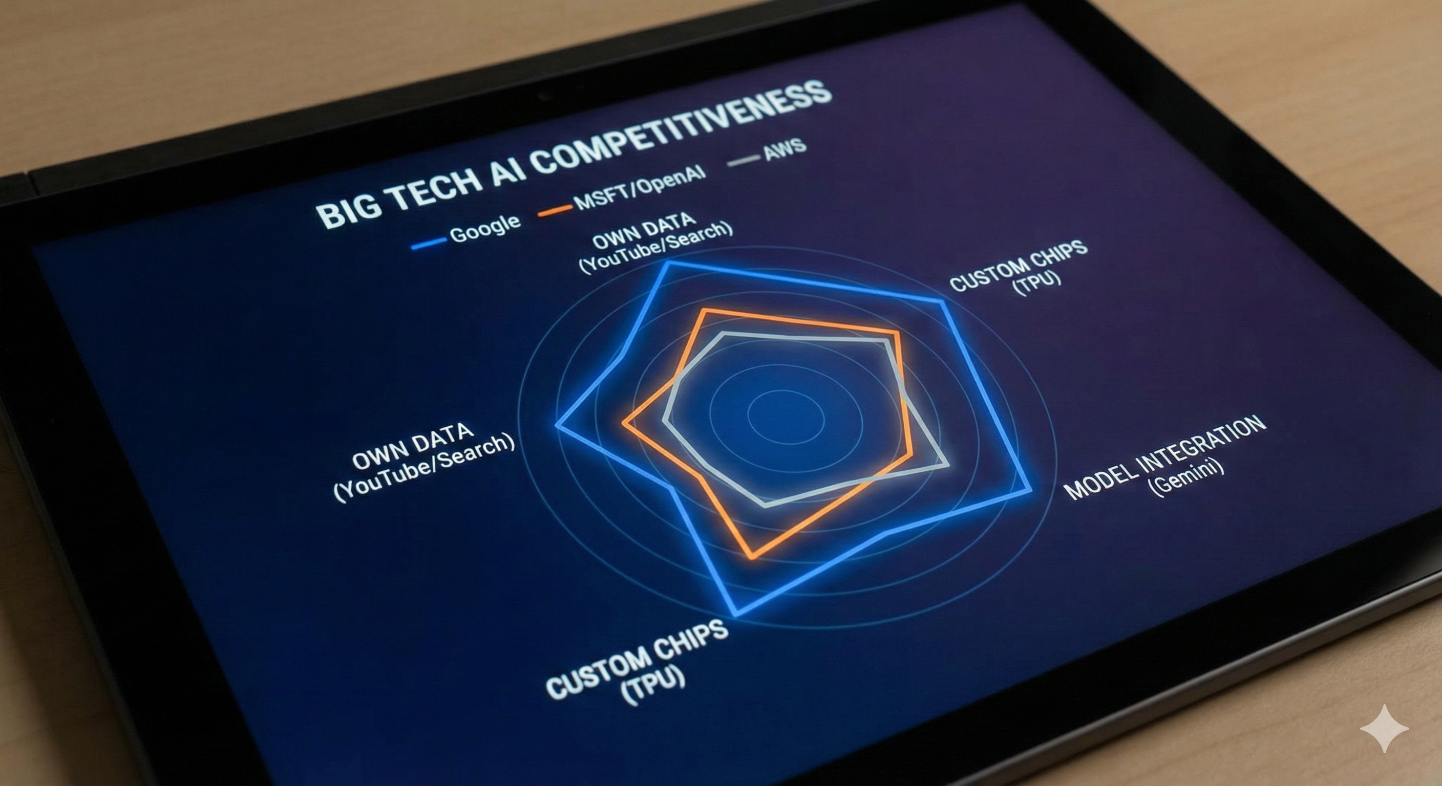 구글이 데이터, TPU 칩, 모델 통합 경쟁력에서 경쟁사보다 앞서 있음을 보여주는 태블릿 화면