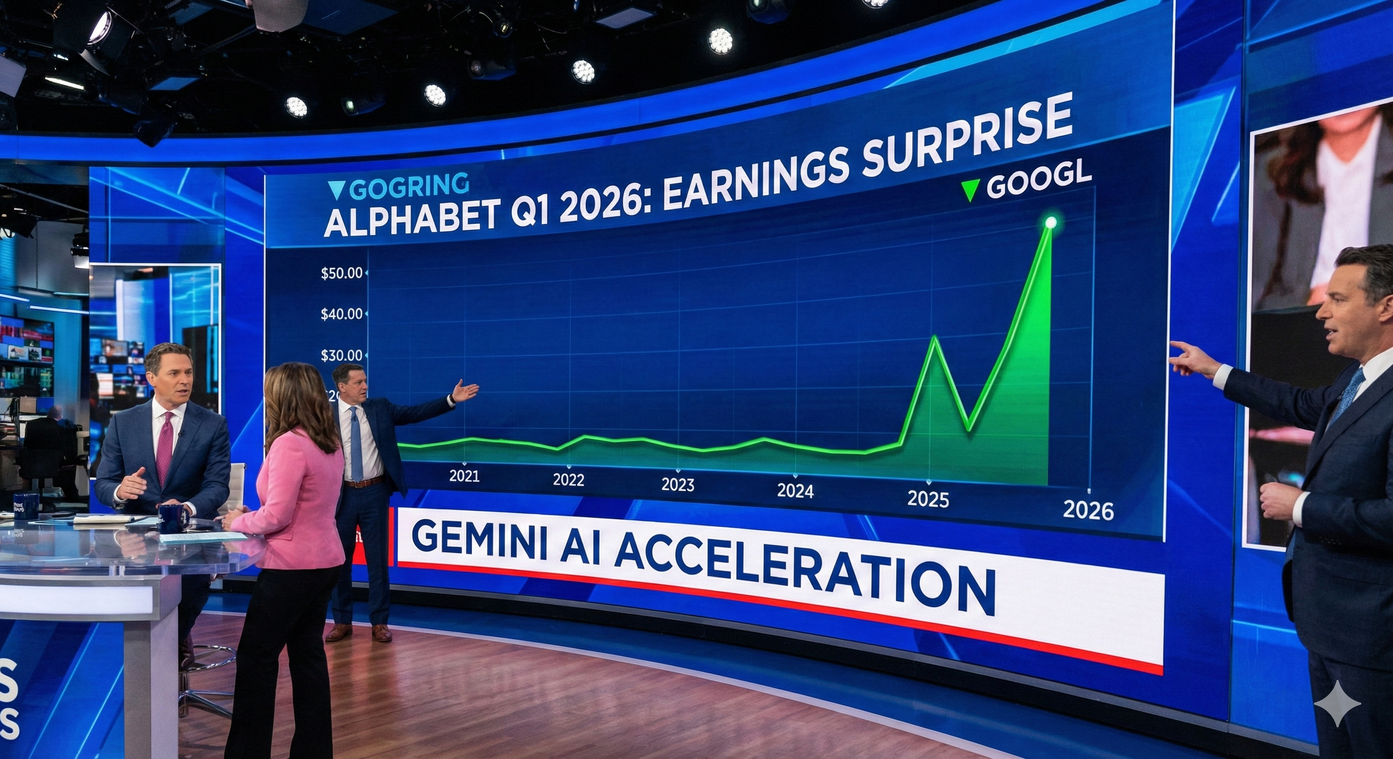 2026년 1분기 구글 실적 발표 현장에서 제미나이 AI 성과로 인해 주가가 급등하는 모습을 보도하는 금융 뉴스 스튜디오의 전경