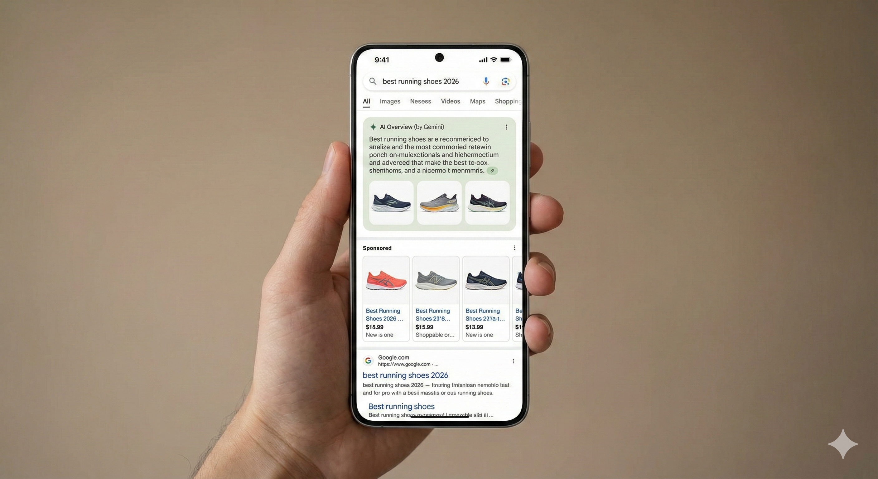스마트폰 화면에 제미나이 AI 요약 답변과 자연스럽게 통합된 스폰서 광고가 함께 표시되는 구글의 하이브리드 검색 인터페이스 모습