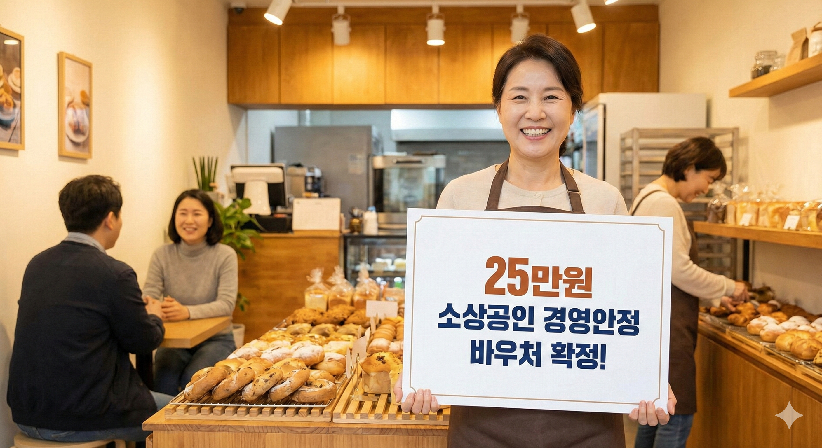 25만원 소상공인 경영안정 바우처 확정 안내판을 들고 미소 짓는 자영업자 사장님과 매장 모습